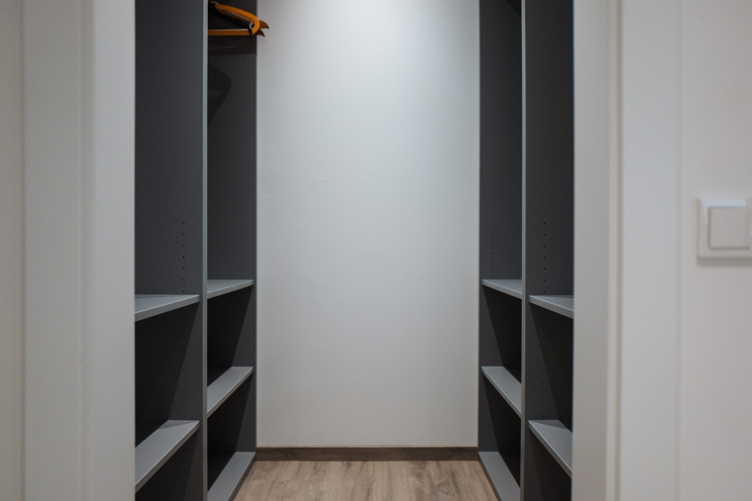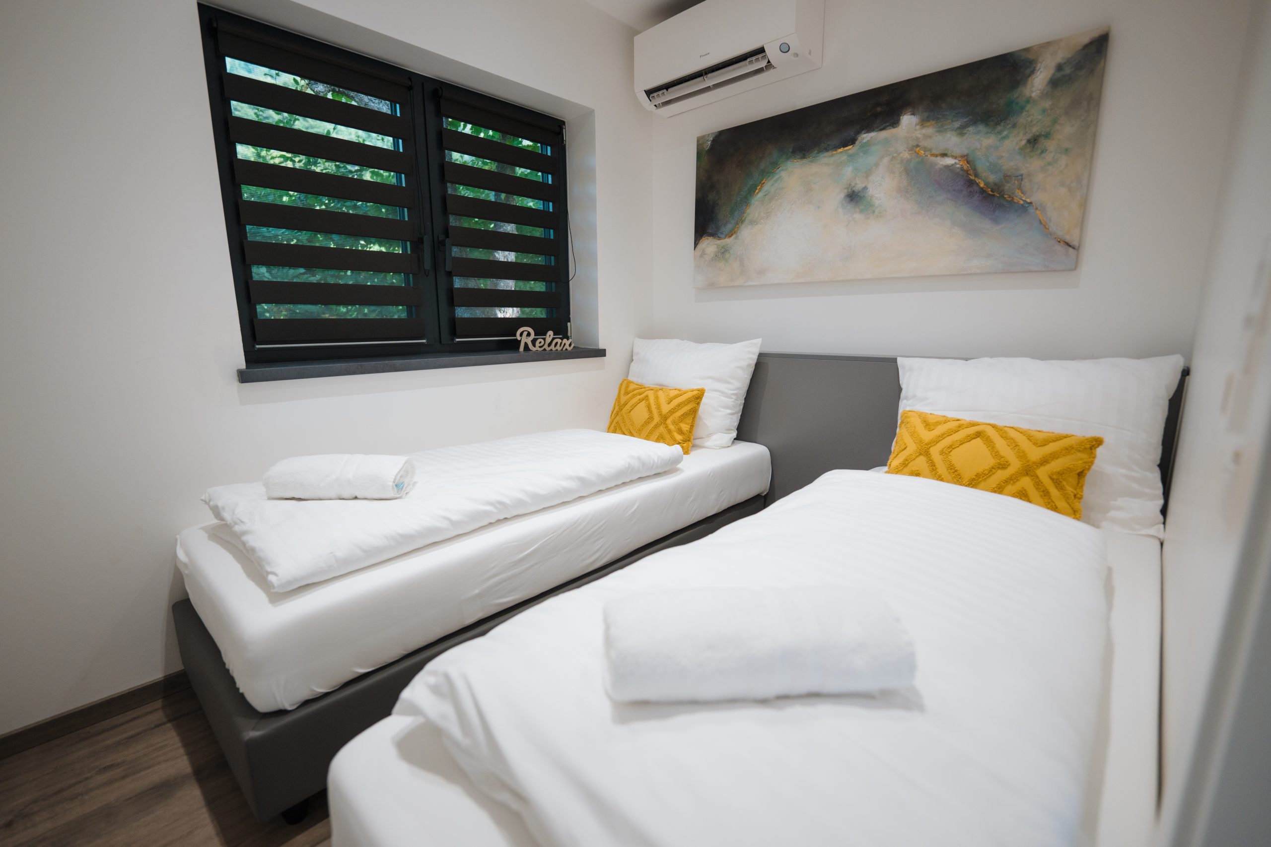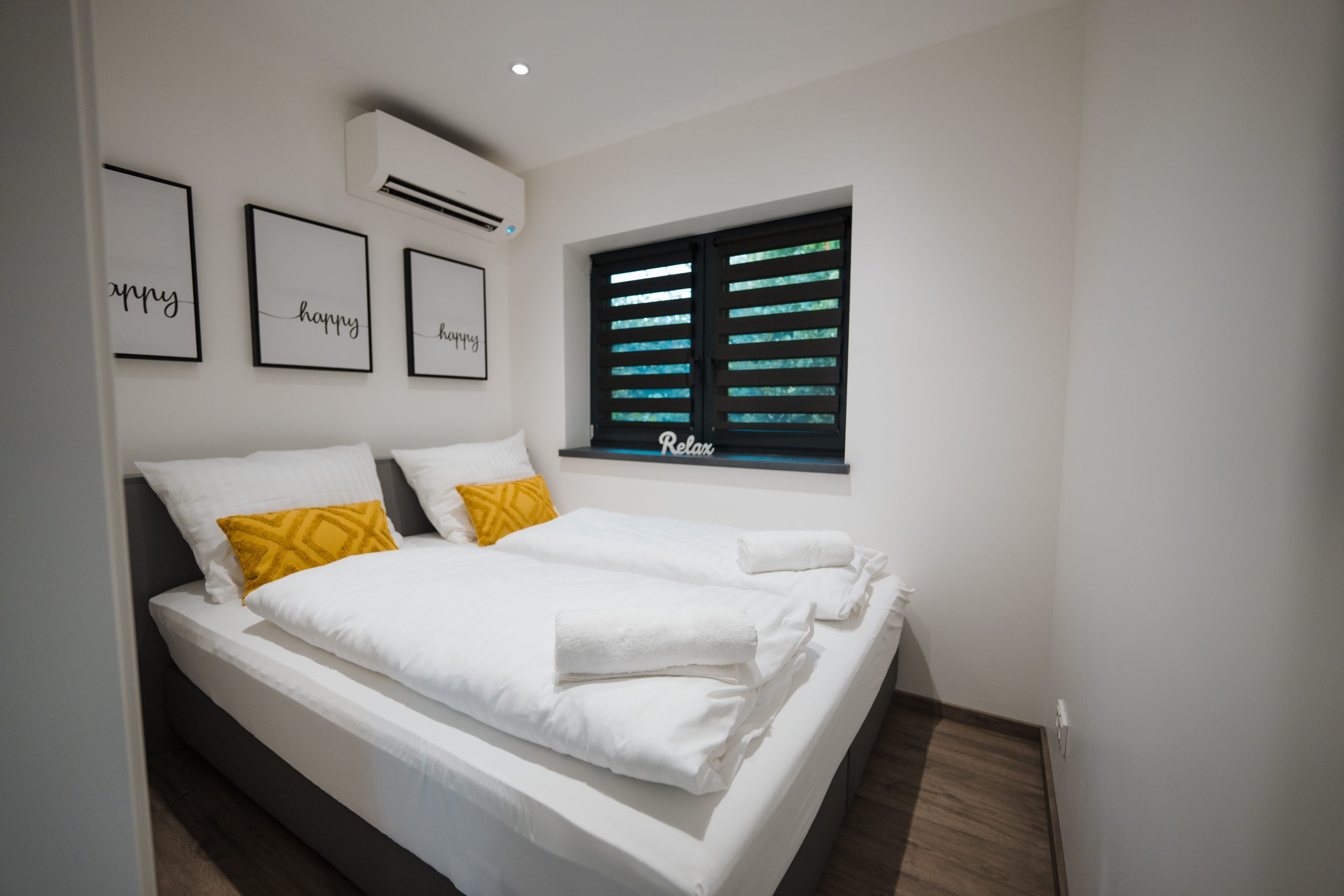 Im Inneren erwartet die Gäste ein stilvoll eingerichtetes Schlafzimmer mit einem komfortablen 160 cm breiten Bett, in dem man herrlich entspannen kann. Darüber hinaus gibt es ein weiteres Schlafzimmer mit einem 80 cm breiten Bett sowie einem Schreibtisch, ideal für Gäste, die auch im Urlaub ein wenig arbeiten oder lesen möchten. Das Badezimmer ist mit einer modernen Dusche und einem WC ausgestattet, und ein begehbarer Schrank bietet ausreichend Platz für die Garderobe.