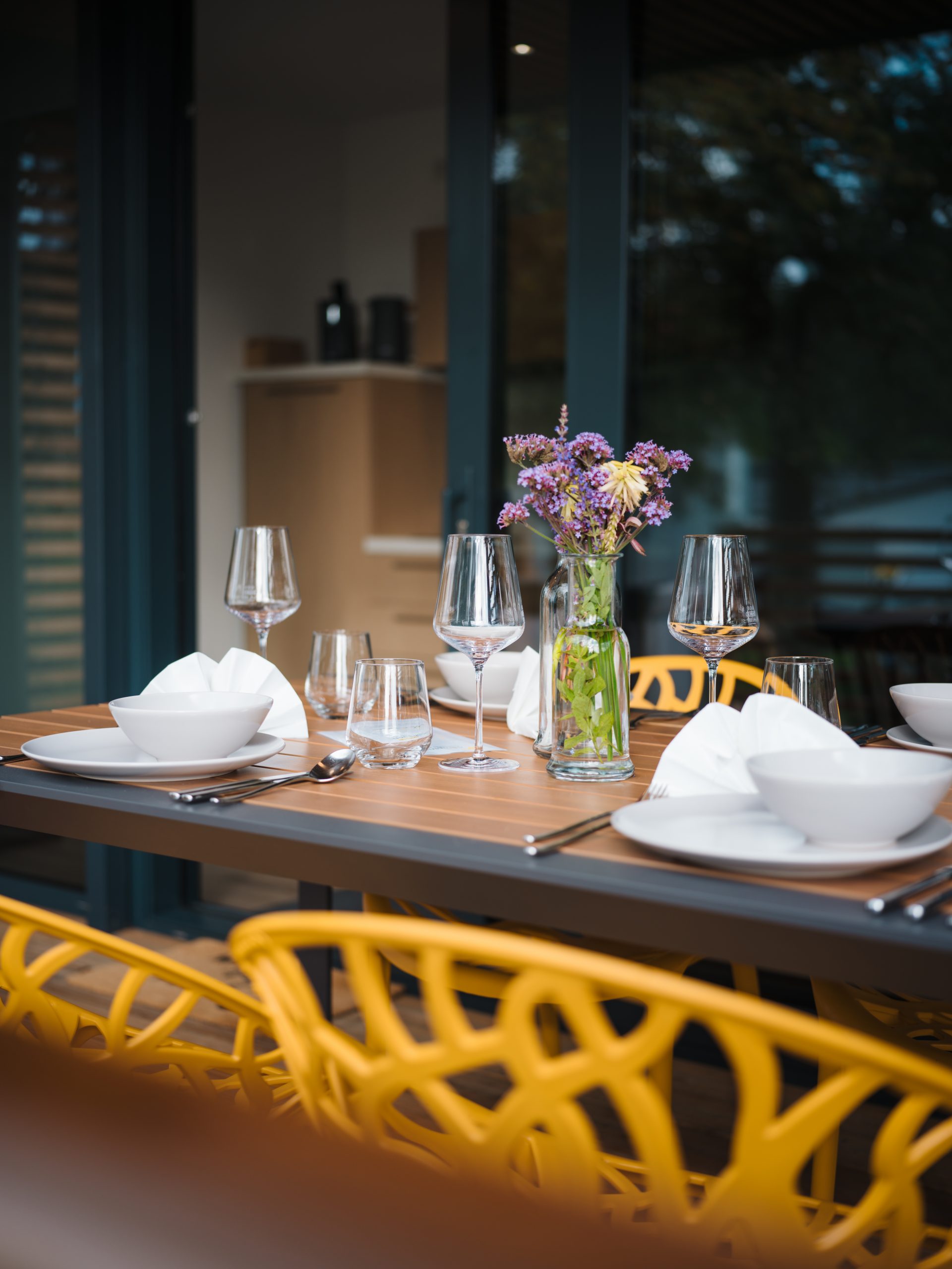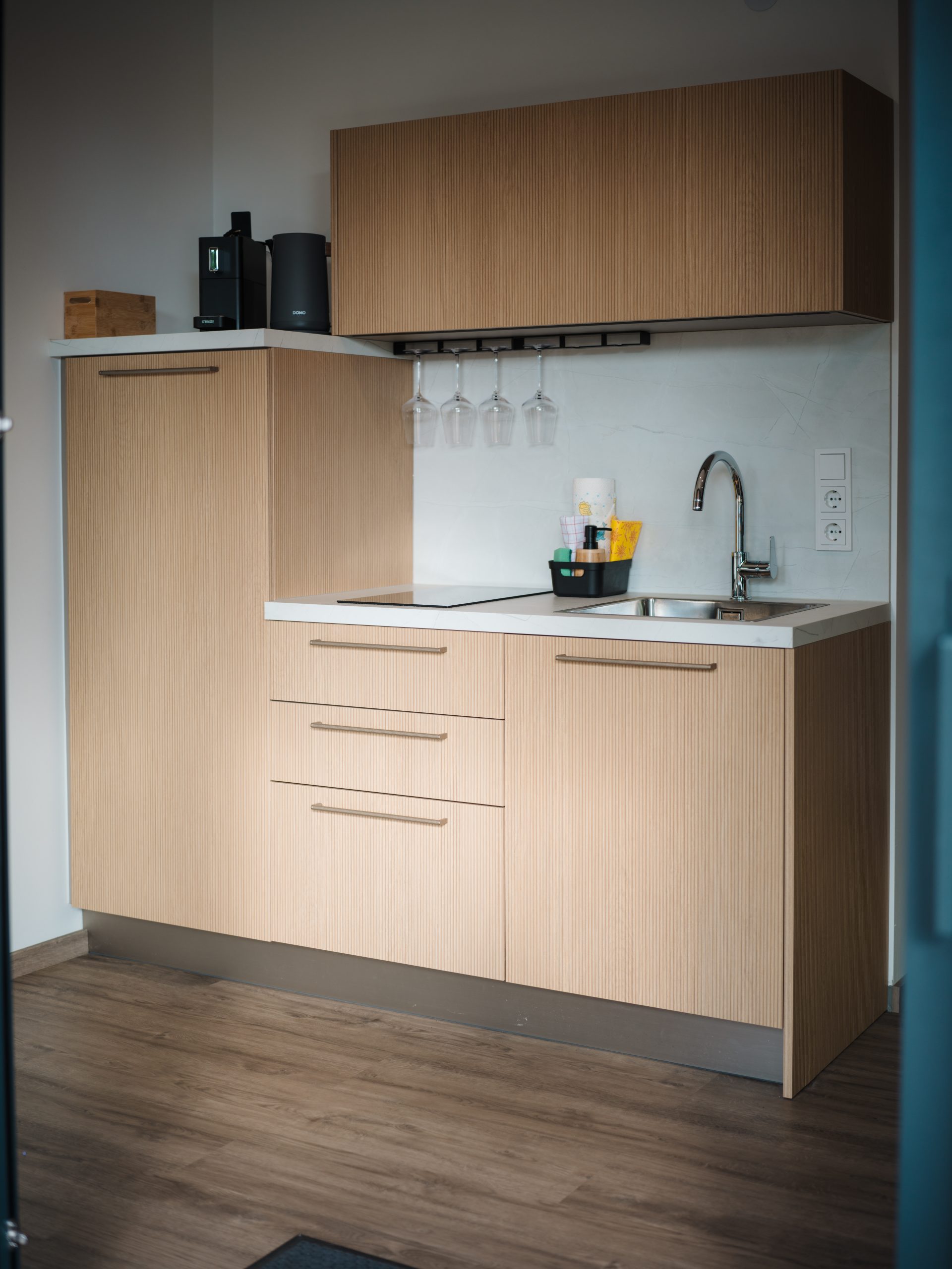 In der gemütlichen Wohnküche, die mit allen wichtigen Geräten ausgestattet ist, einschließlich einer Kaffeemaschine, lädt eine ausziehbare Couch zu entspannten Abenden ein. Der Übergang zur überdachten Terrasse mit einer gemütlichen Sitzecke ist fließend, sodass die Gäste bei jedem Wetter den Außenbereich genießen können.